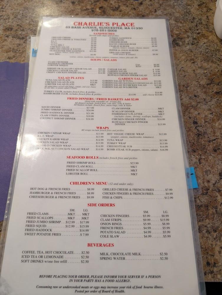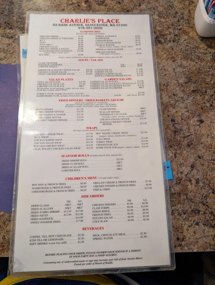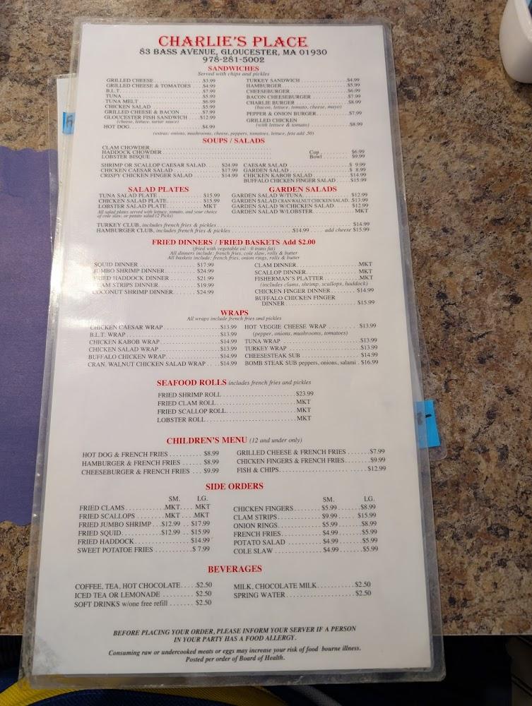 Located at 83 Bass Ave, Gloucester, MA, Charlie's Place sits in a charming part of town, just a stone's throw from the picturesque Good Harbor Beach. This relaxed seafood restaurant thrives on serving fresh flavors and hearty portions, drawing in a steady stream of locals and visitors attracted by its cozy vibe. The surrounding area adds to the appeal; it’s a short drive to downtown Gloucester’s vibrant shops and coastal scenery, making it a convenient pit-stop for an enjoyable meal. The restaurant embraces a true community feel, where regulars know each other by name and staff greet you like an old friend. Ample free parking is a blessing, especially during peak tourist season, and accessibility features like wheelchair ramps ensure that everyone can enjoy the laid-back dining experience. Open every day of the week, Charlie’s Place is a go-to for breakfast, lunch, or dinner, serving up the best of New England seafood in a casual setting.